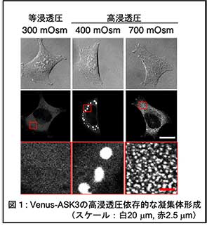 我々は、2012年に周囲の浸透圧変化に応じて細胞内でリン酸化活性を変化させるApoptosis Signal-regulating Kinase (ASK3)というキナーゼを報告しました4。このキナーゼの浸透圧応答はとても面白く、分単位の間に、低浸透圧で活性化、高浸透圧で逆に不活性化するという両方向性を示します。周囲の浸透圧の情報を細胞内のシグナル伝達に変換するために非常に適した分子として着目し、解析を進めています。ASK3の機能としては、浸透圧で変化した細胞体積の回復5や、腎臓におけるWNK-SPAK/OSR1経路の制御を介した血圧調節4に関わることを明らかにしています。さらに、独自のゲノムワイドsiRNAスクリーニングの結果に端を発する研究から、ASK3がどのように浸透圧でキナーゼ活性を変化させるのか少しずつ分子メカニズムがわかってきています6。ASK3は高浸透圧にさらされた細胞内で液-液相分離(LLPS)を引き起こし、可逆的な凝集体を形成します(図1)。凝集体形成できないASK3変異体は浸透圧応答性を失うことや、浸透圧の程度によって凝集体の大きさや数が変わることから、この凝集体形成が浸透圧の感知に重要な役割を担っているようです。現在は、この凝集体形成や性質の変化(大きさ、流動性など)に関わるメカニズムの解析からASK3の浸透圧応答機構を明らかにしようとしています。