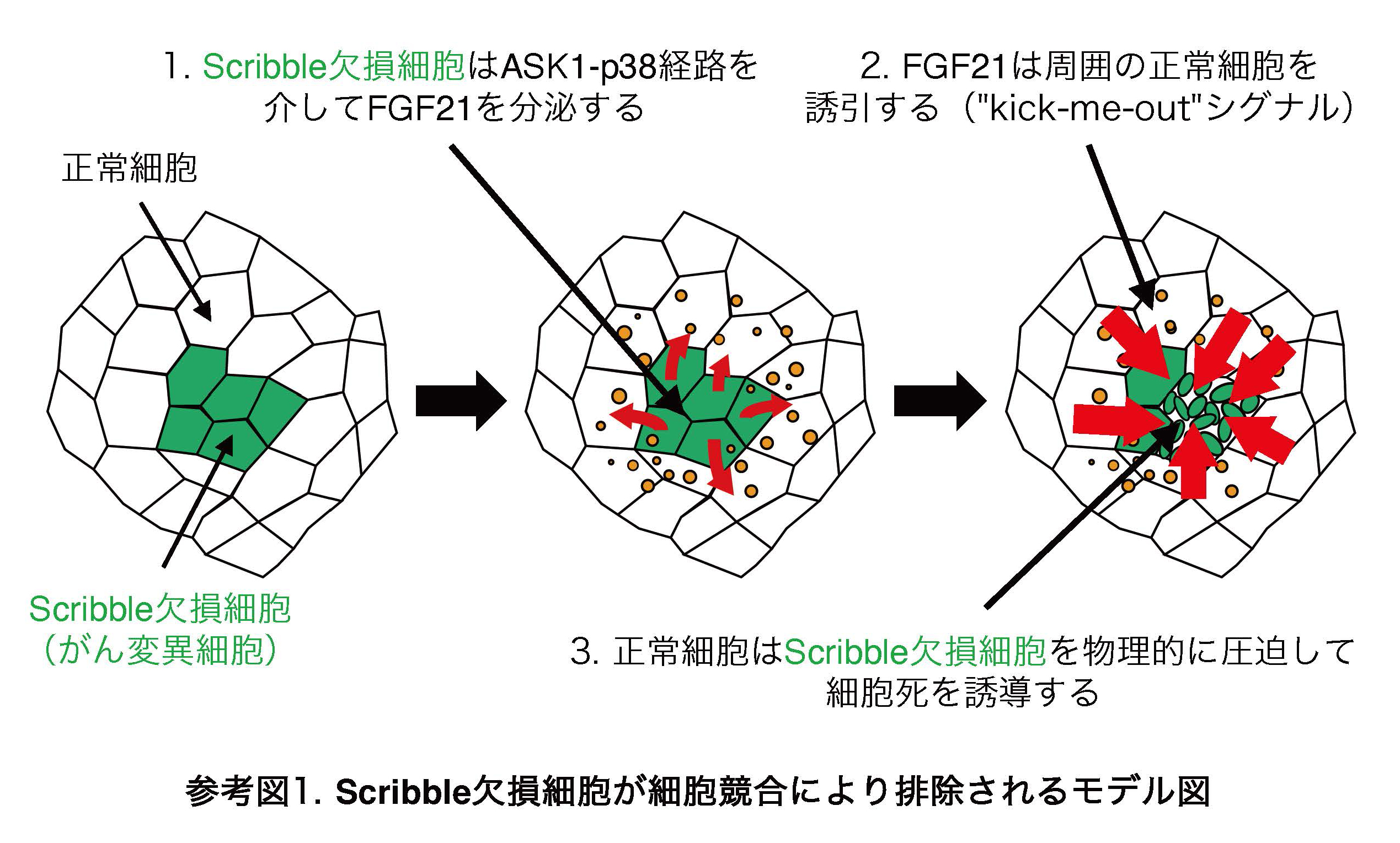 最近、Scribble欠損細胞から分泌された線維芽細胞増殖因子FGF21が細胞競合を誘導することを発見しました(参考図1)。FGF21は、いわば“kick-me-out”シグナルとして周囲の正常細胞を誘引することで、Scribble欠損細胞が物理的に圧迫されて排除されることを見出しました。さらに、当研究室で長年解析を行ってきた ASK1が、FGF21の発現誘導を担うとともに細胞競合を誘導することも明らかにしました。現在、マウスレベルの新たなin vivo細胞競合解析系を構築し、FGF21による細胞競合が生体内でがん抑制機構として働くか検証しています。本グループでは、このFGF21による細胞競合機構を足がかりとしたCandidateアプローチと哺乳類細胞競合系を用いた大規模スクリーニングによる網羅的なアプローチを統合することで、細胞競合を制御する分子基盤の全容解明を目指して研究しています(参考図2:学術変革領域研究(A) 多細胞生命自律性HPのグループ紹介より引用)。