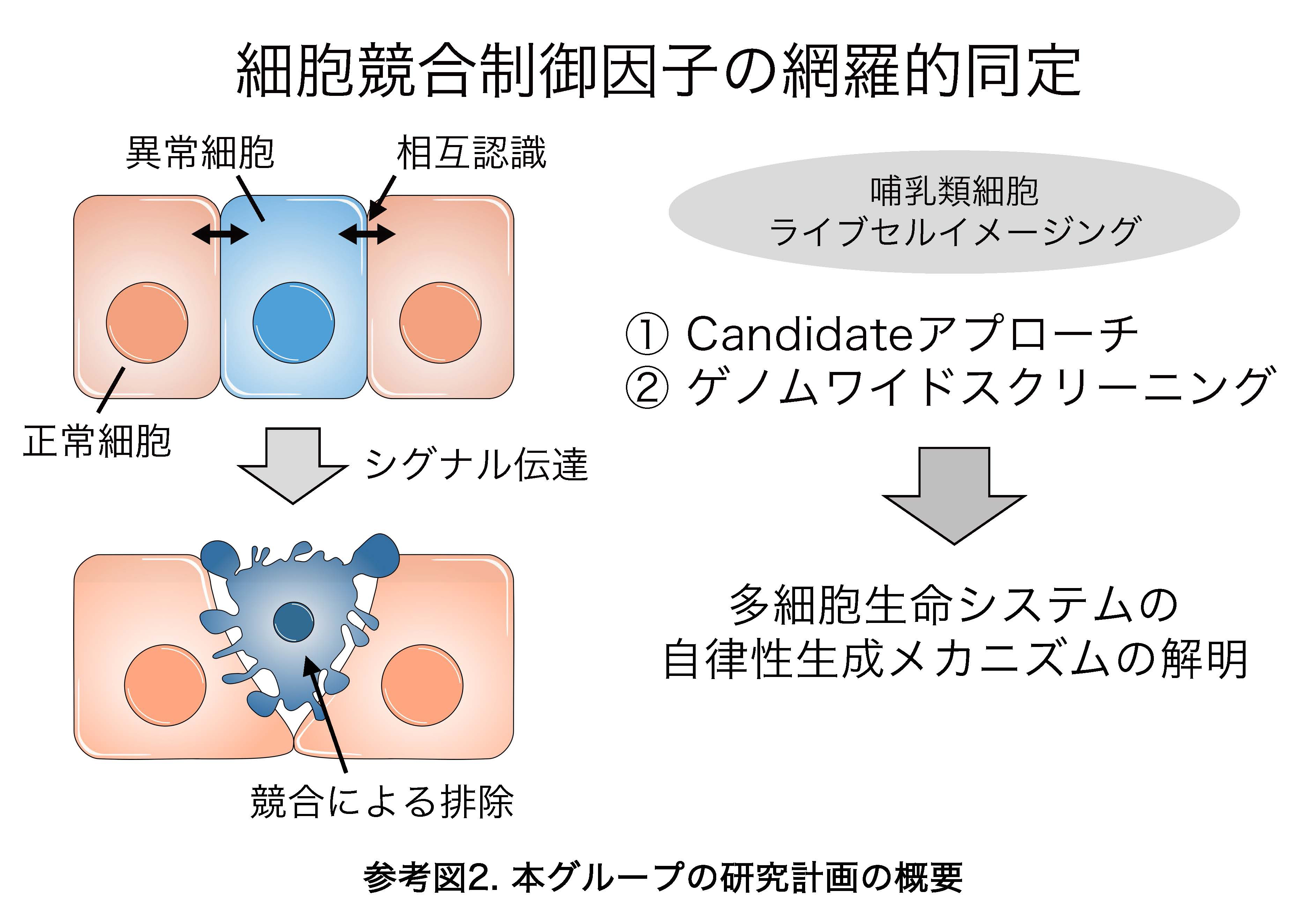 近年、異常形質を獲得した細胞を認識・排除するメカニズムの一つとして細胞競合という機構が注目されています。細胞競合とは、異なる性質を持った2つの細胞集団が生存をかけて争い、一方が他方を選択的に排除する現象です。例えば、発がんの初期段階において上皮組織に出現したがん変異細胞を周囲の正常細胞が認識・排除する細胞競合は、がん免疫などとは異なった新たながん抑制機構として注目されています。そのためこの分子機構の解明は、がん生物学の発展に貢献するだけでなく、新たながん治療戦略の構築に繋がる重要な研究テーマです。しかし、正常細胞によるがん変異細胞の認識・排除機構には未だ不明な点が多く残されています。